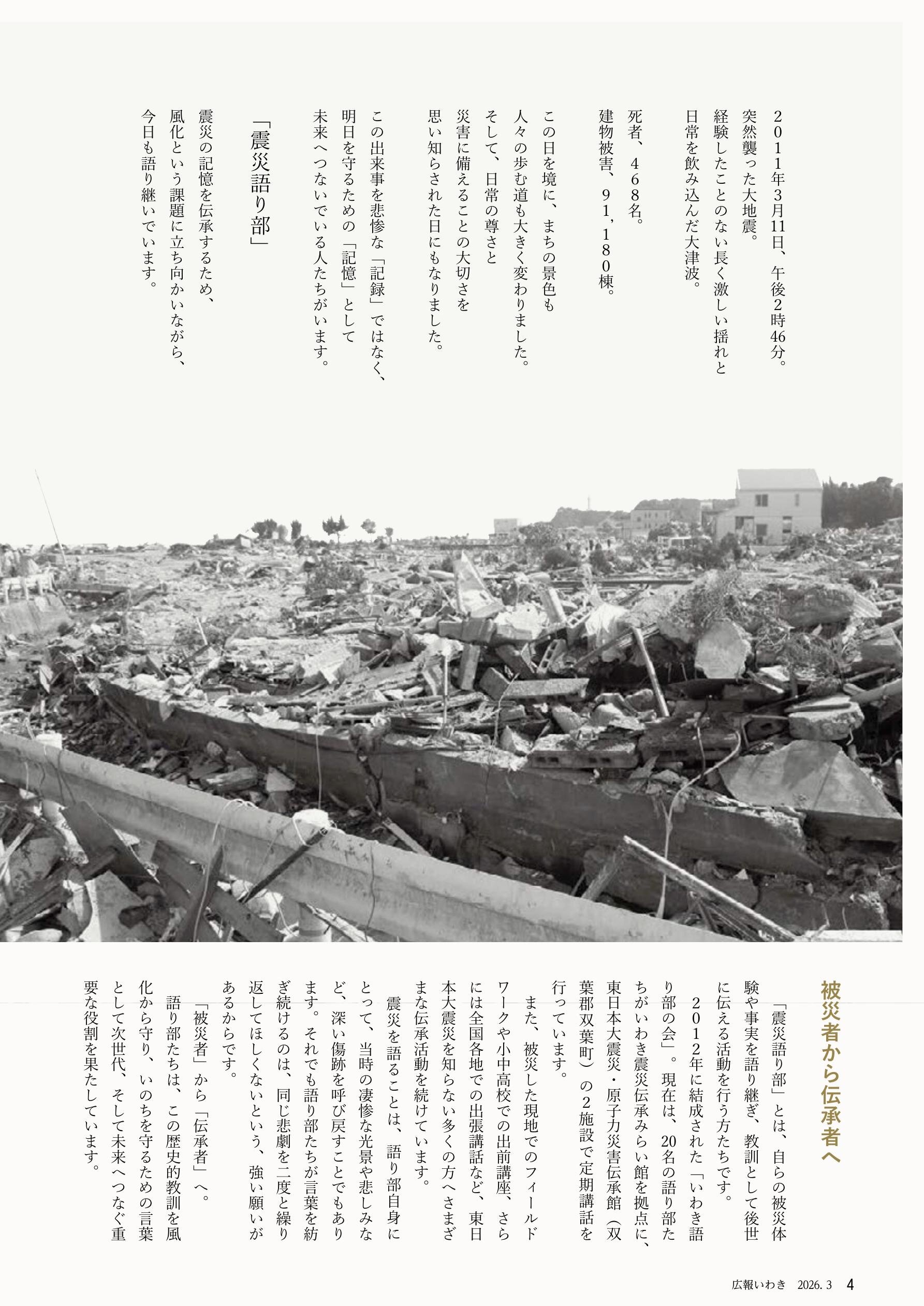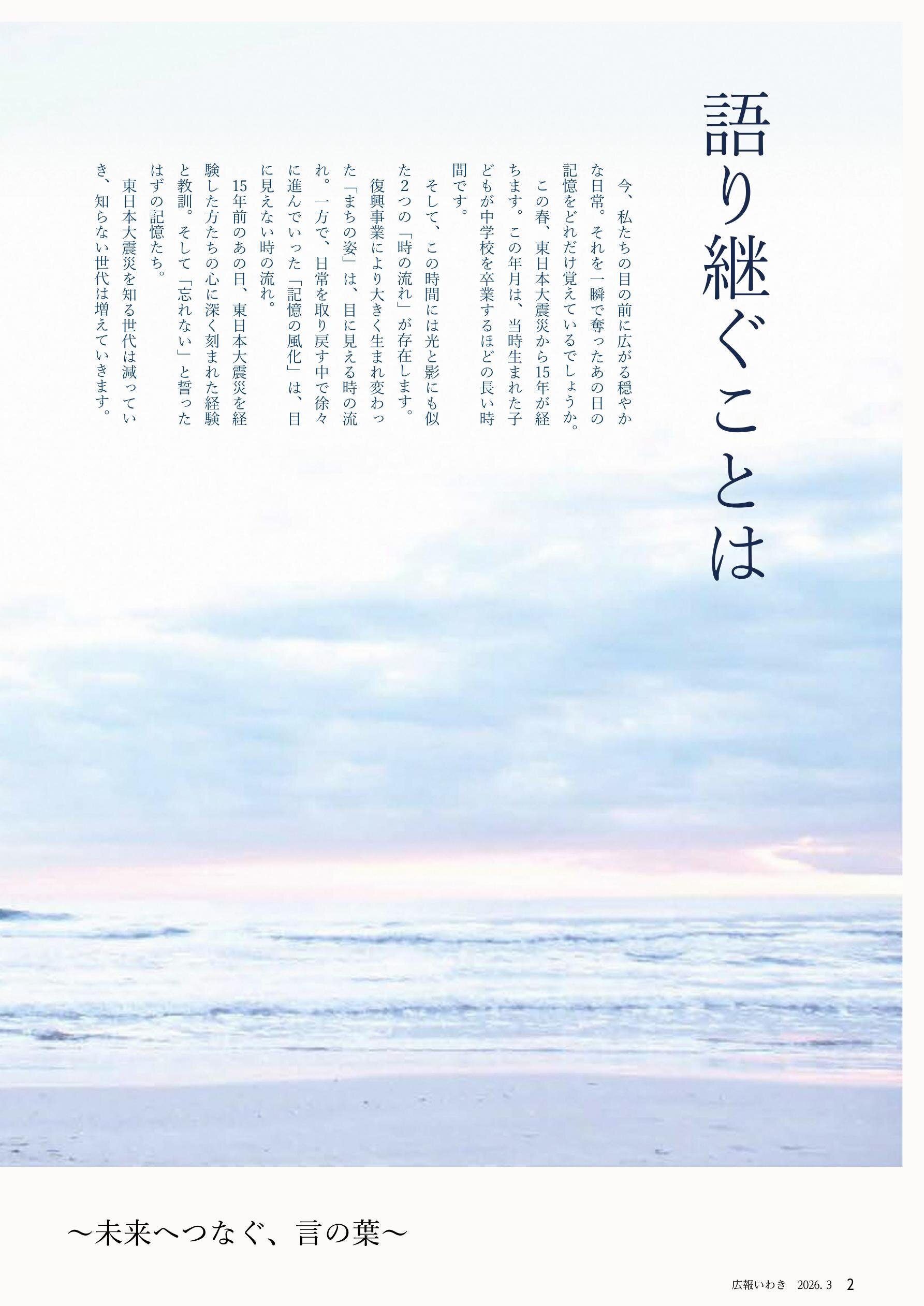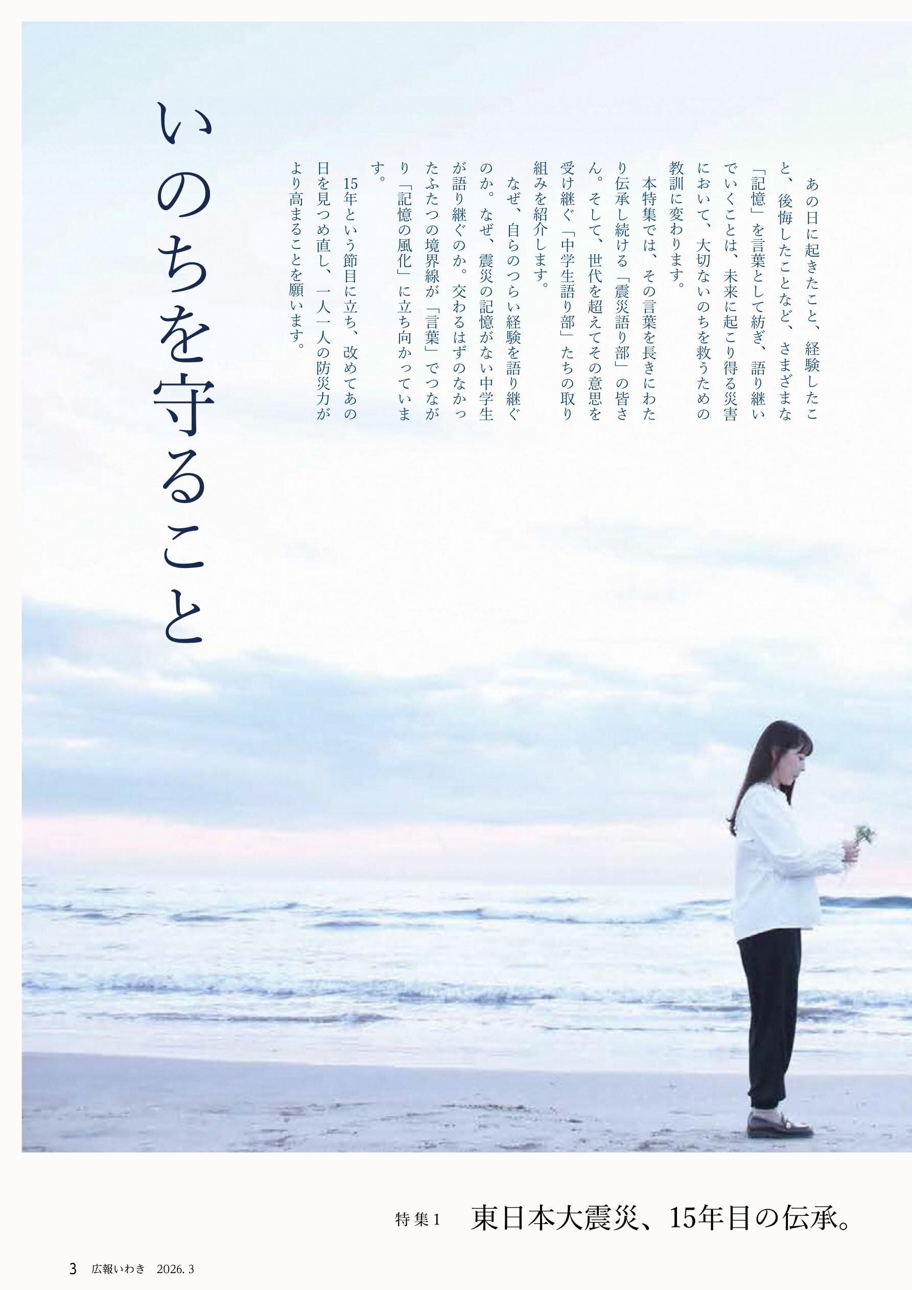特集1 東日本大震災、15年目の伝承。 ~未来へつなぐ、言の葉~ …1~11 特集2 いわき吹奏楽アカデミー …12~13
